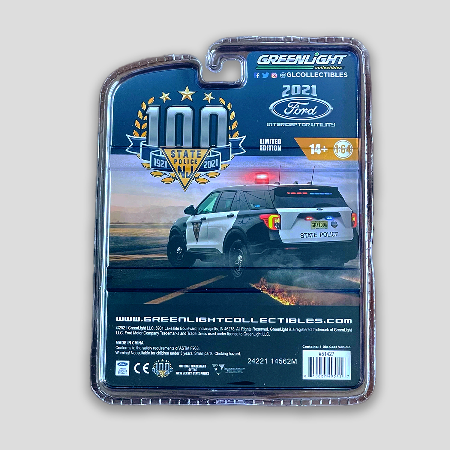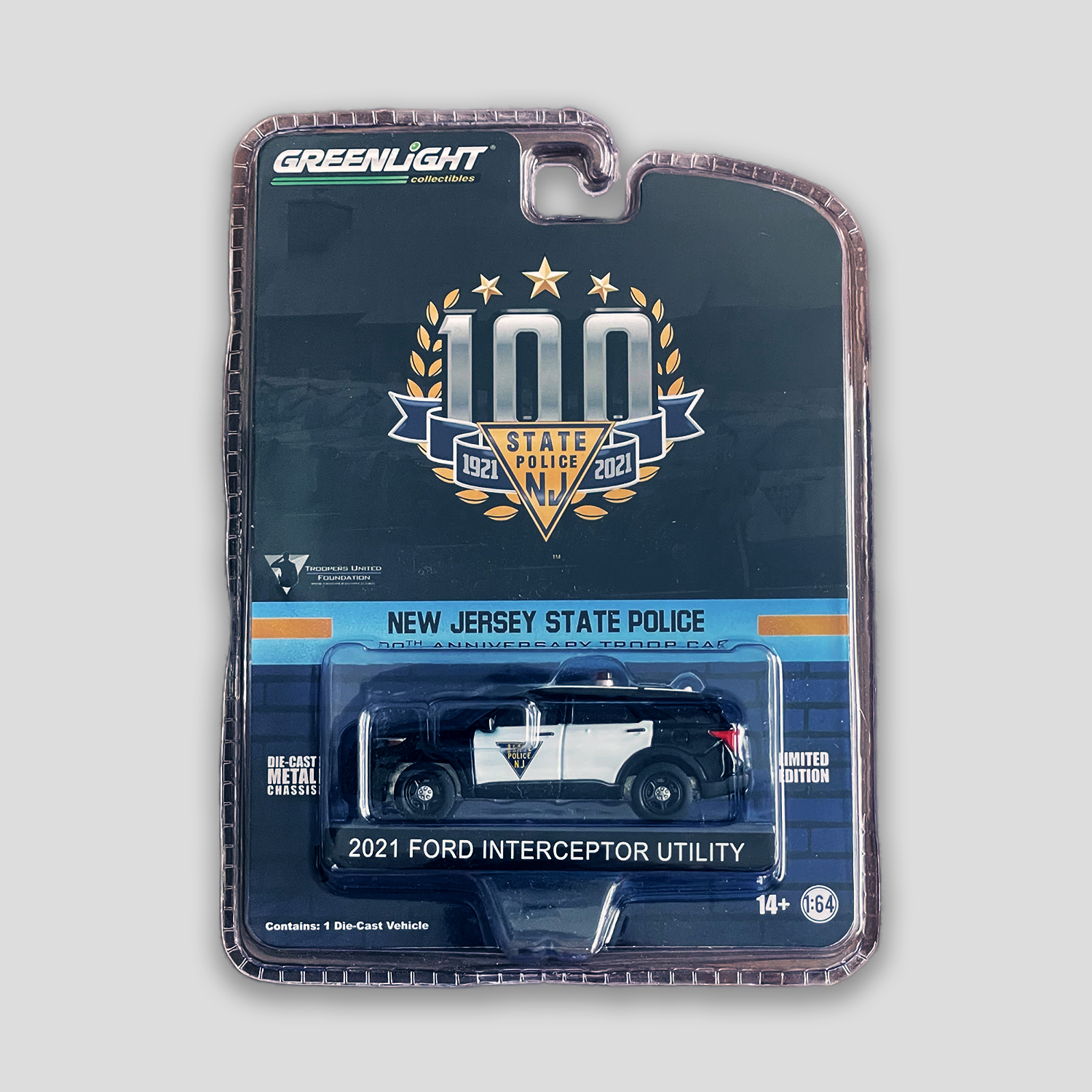In commemoration of the 100th Anniversary of the New Jersey State Police, The 100th Anniversary Committee designed 12 retro Troop Cars with a paint scheme consistent to the Troop Cars of the 1950’s and 1960’s. These Commemorative Troop Cars patrolled all regions of the State throughout 2021. To continue with our celebration, Greenlight Collectibles produced these Custom TUF Exclusive, limited edition, 2021 Ford Police Interceptor Utility 1/64 Die-cast Model Troop Cars.