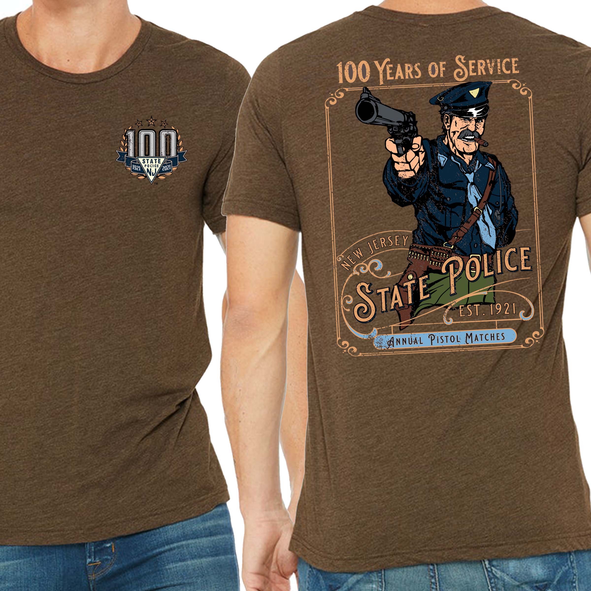 This heather brown shirt displays a variation of the official 100th Anniversary logo paying homage to the original triangular patch colors, Navy/Eggshell white. The back of the shirt displays a Trooper sporting the original Class A summer uniform while competing in one of the Annual Pistol Matches.