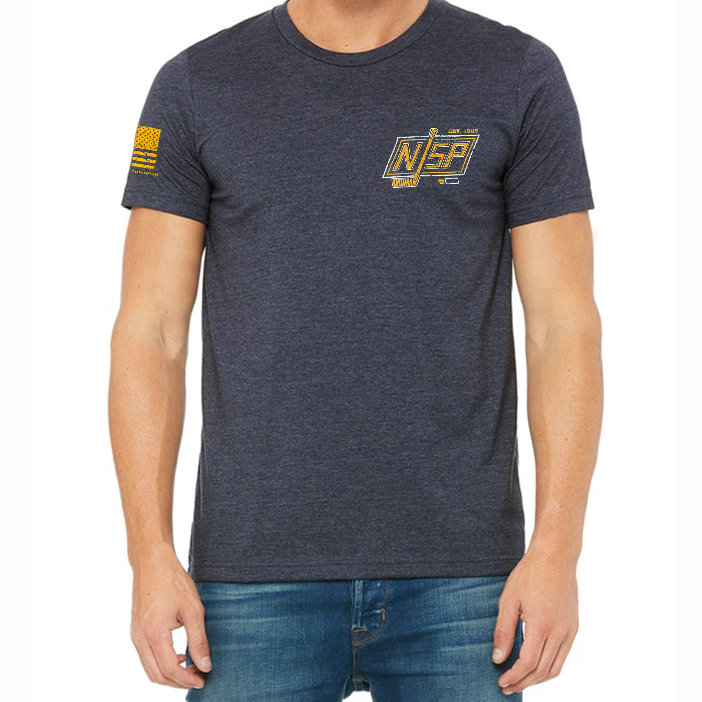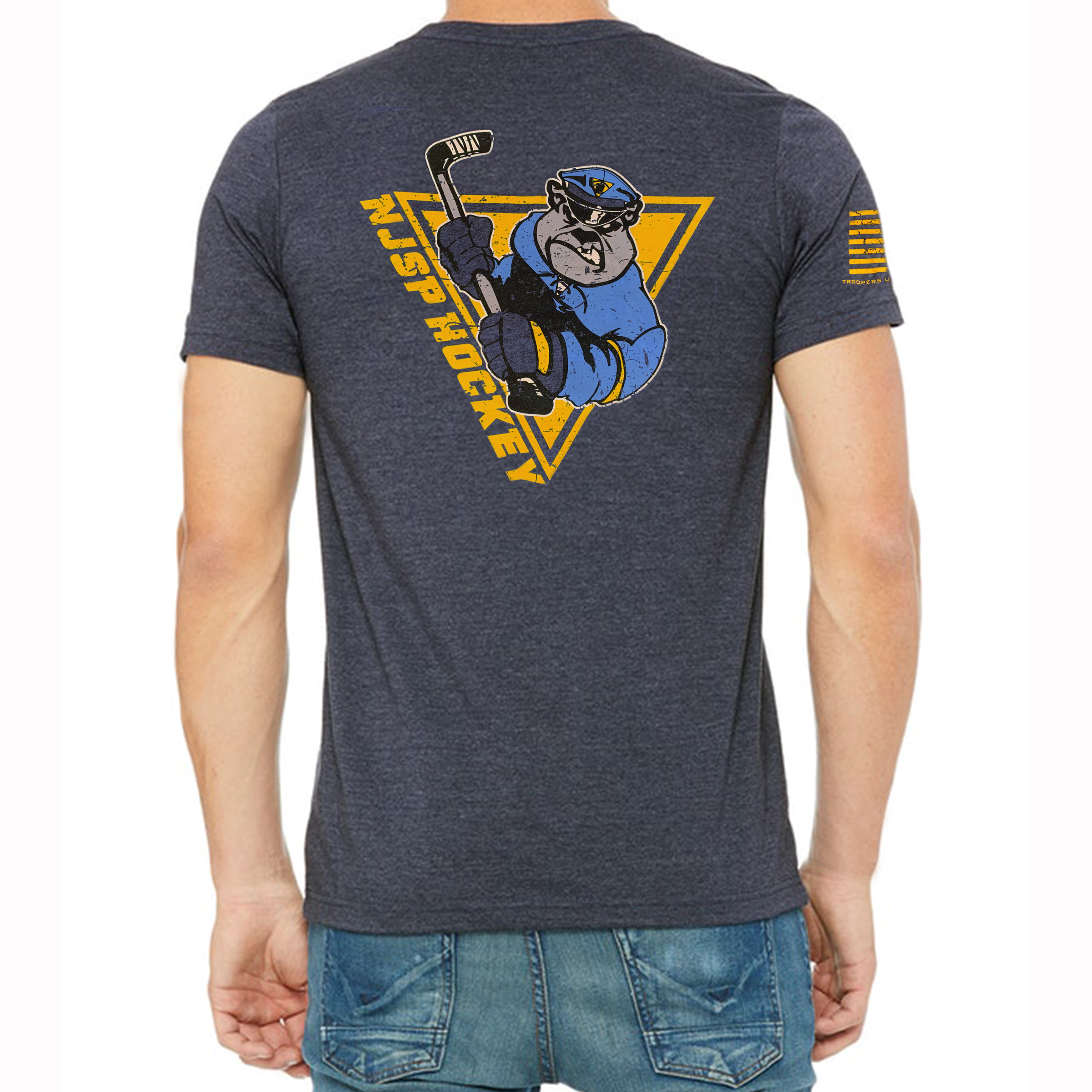 This shirt was designed specifically for the New Jersey State Police Hockey Club by the Trooper United Foundation. This heather Tri-blend navy blue shirt is made of super soft comfortable fabric with distressed style screen printing giving the weathered and worn appearance that you’re looking for.