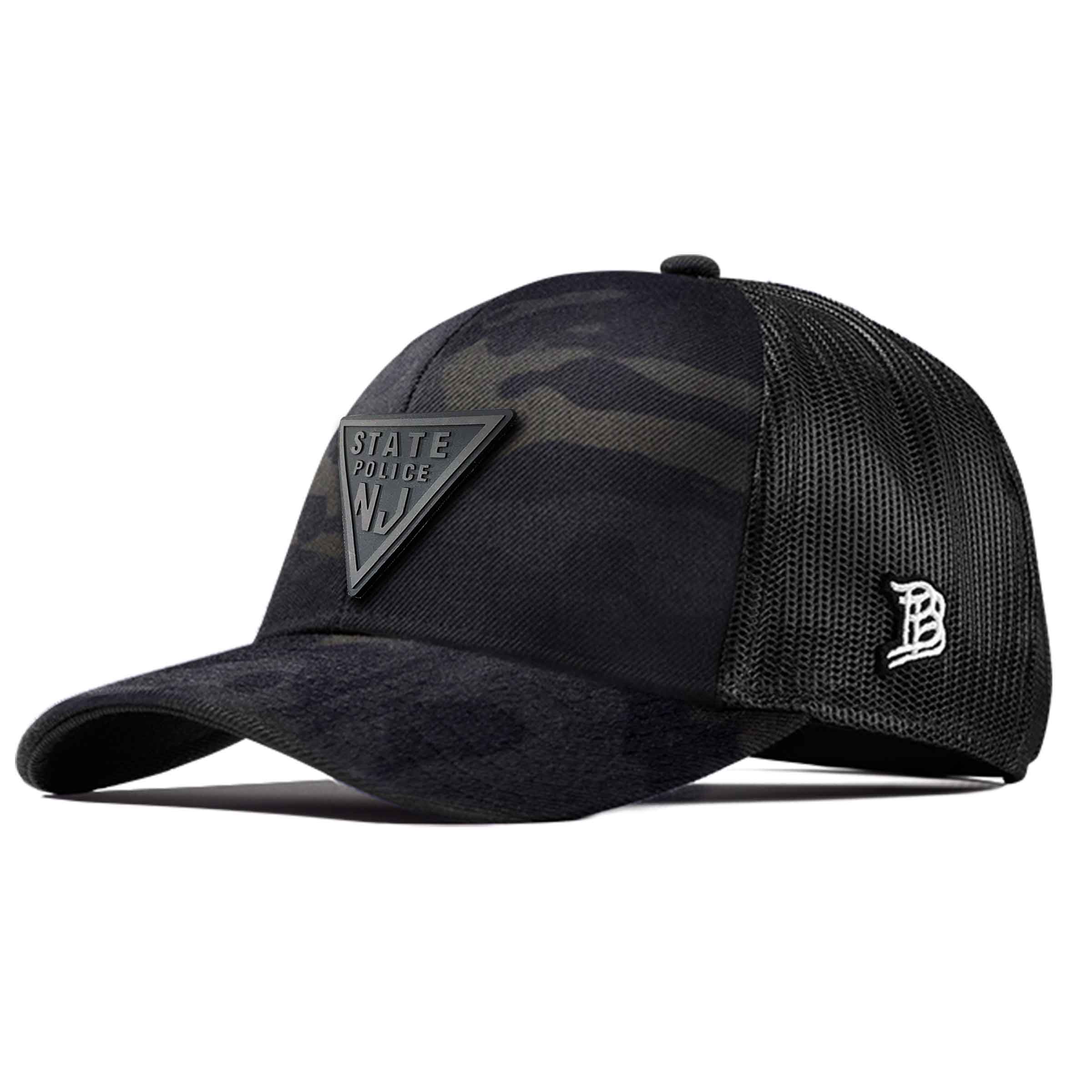 This NEW  Multi Cam Adjustable Snapback hat with Flexfit Technology  displays a stealth New Jersey State Police Patch logo molded into a raised and recessed PVC patch.