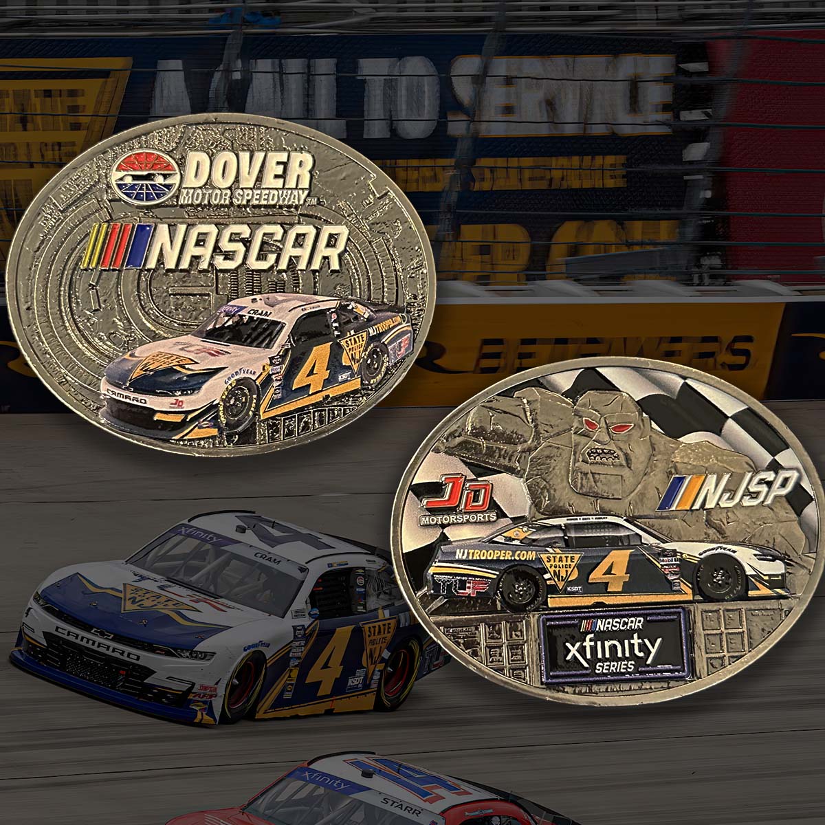 This NEW Challenge Coin commemorates the New Jersey State Police and the Troopers United Foundation NASCAR which raced in the 2024 Xfinity Series® . Driver, Dawson Cram piloted the No. 4 for JD Motorsports Racing, as he took on the Monster Mile at Dover Motor Speedway. Don’t miss out on this limited edition NASCAR Challenge Coin before it’s gone!