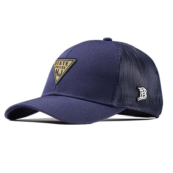 This NEW Navy Adjustable Snapback hat with Flexfit Technology displays a muted blue and gold New Jersey State Police Patch logo molded into a raised and recessed PVC patch.