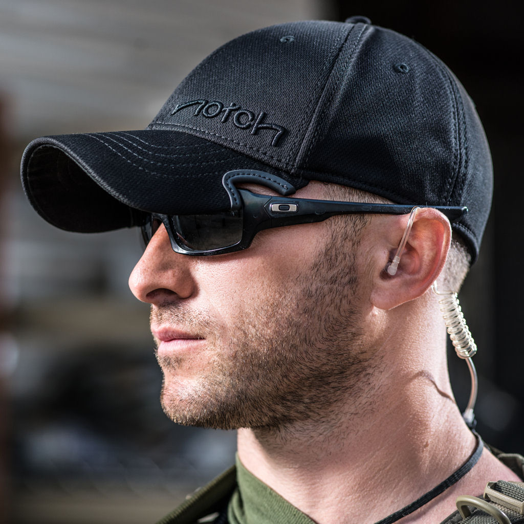 The Standard Notch (pictured above) is designed to work with most wrap-around or sport style sunglasses, shooting glasses, and safety glasses. These styles have a curved appearance, designed to conform to the contour of the head.
