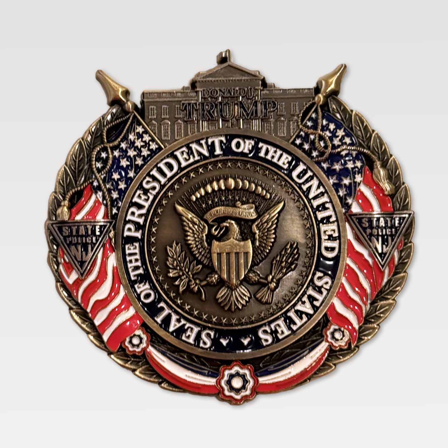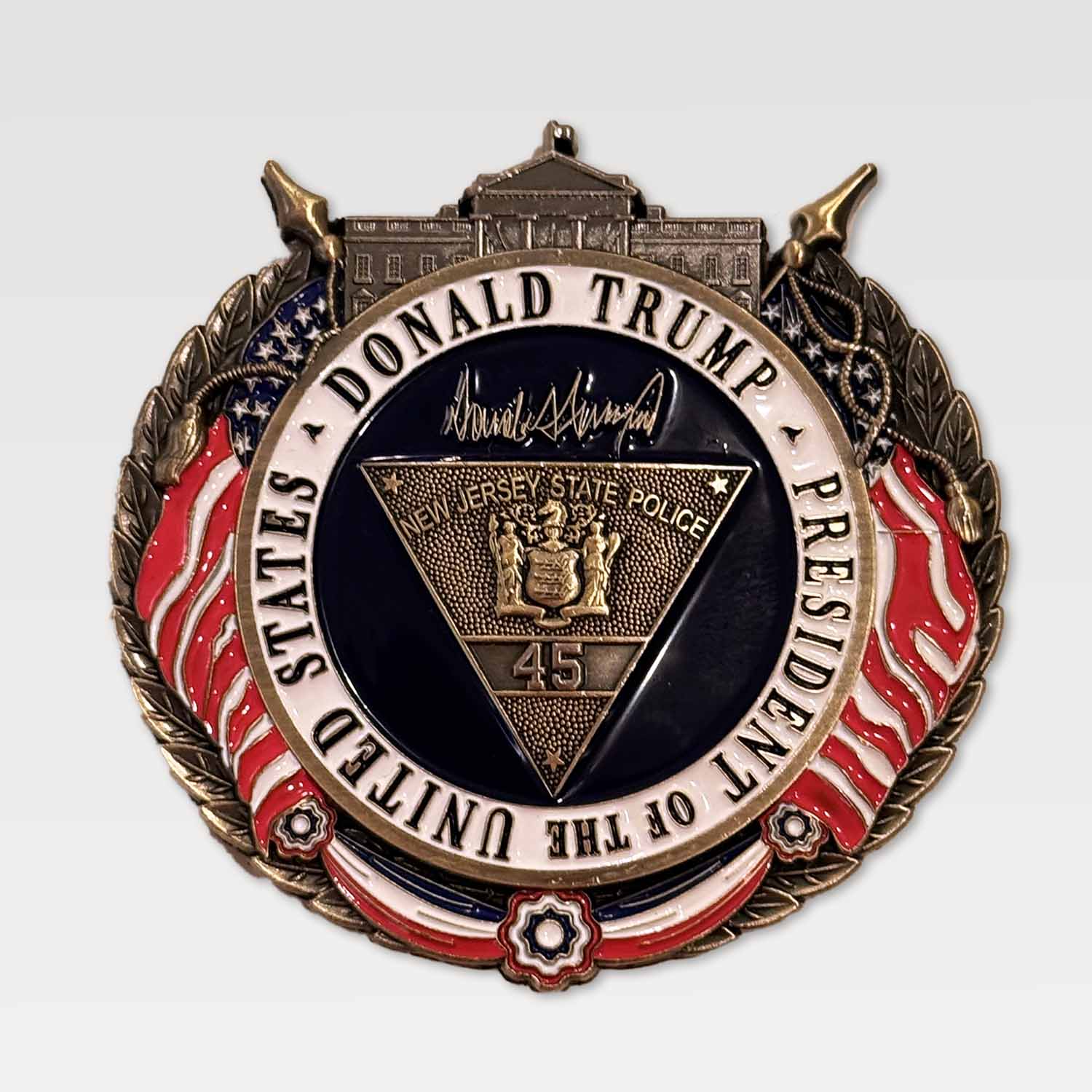 Introducing an exclusive collectible that pays homage to an extraordinary moment in NJSP history: the NEW Challenge Coin celebrating the issuance of unassigned badge number 45 by the New Jersey State Police Command Staff to President Donald J. Trump in 2017.
